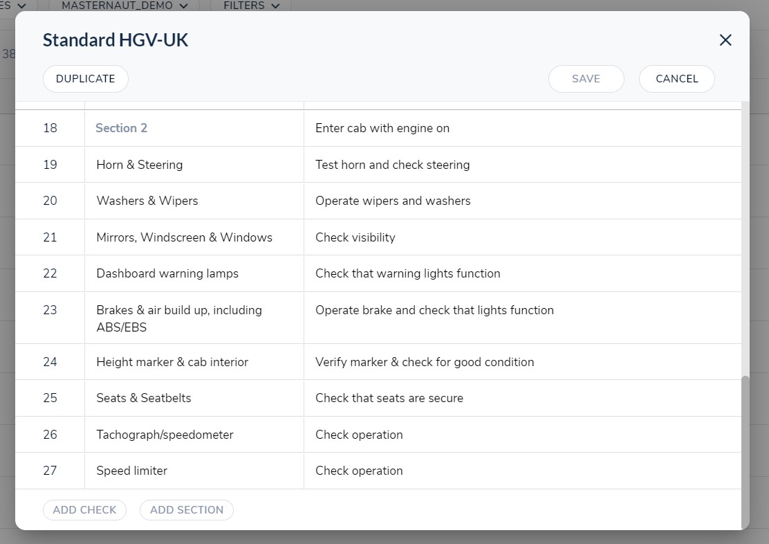 If you wish to copy a current template, and use this for a new template you can do so by selecting the ‘Duplicate’ button within the custom template pop-out. The duplication of this will copy all checks and sections from the previous template, and these can then be changed within this newly created template.