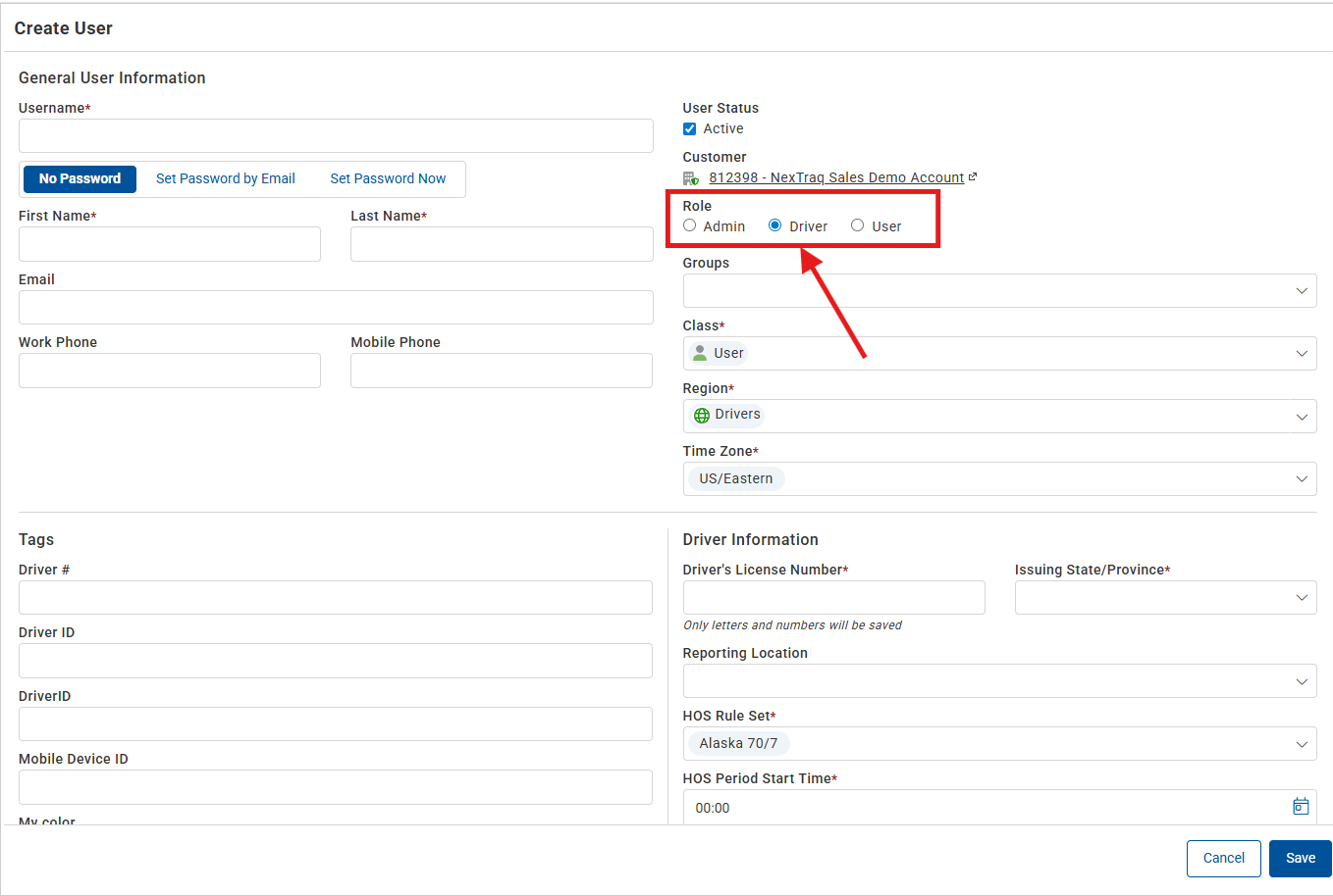 Role: Check which type of user this is. If you select the Driver Role, a Driver Information section will display (see below). | |
